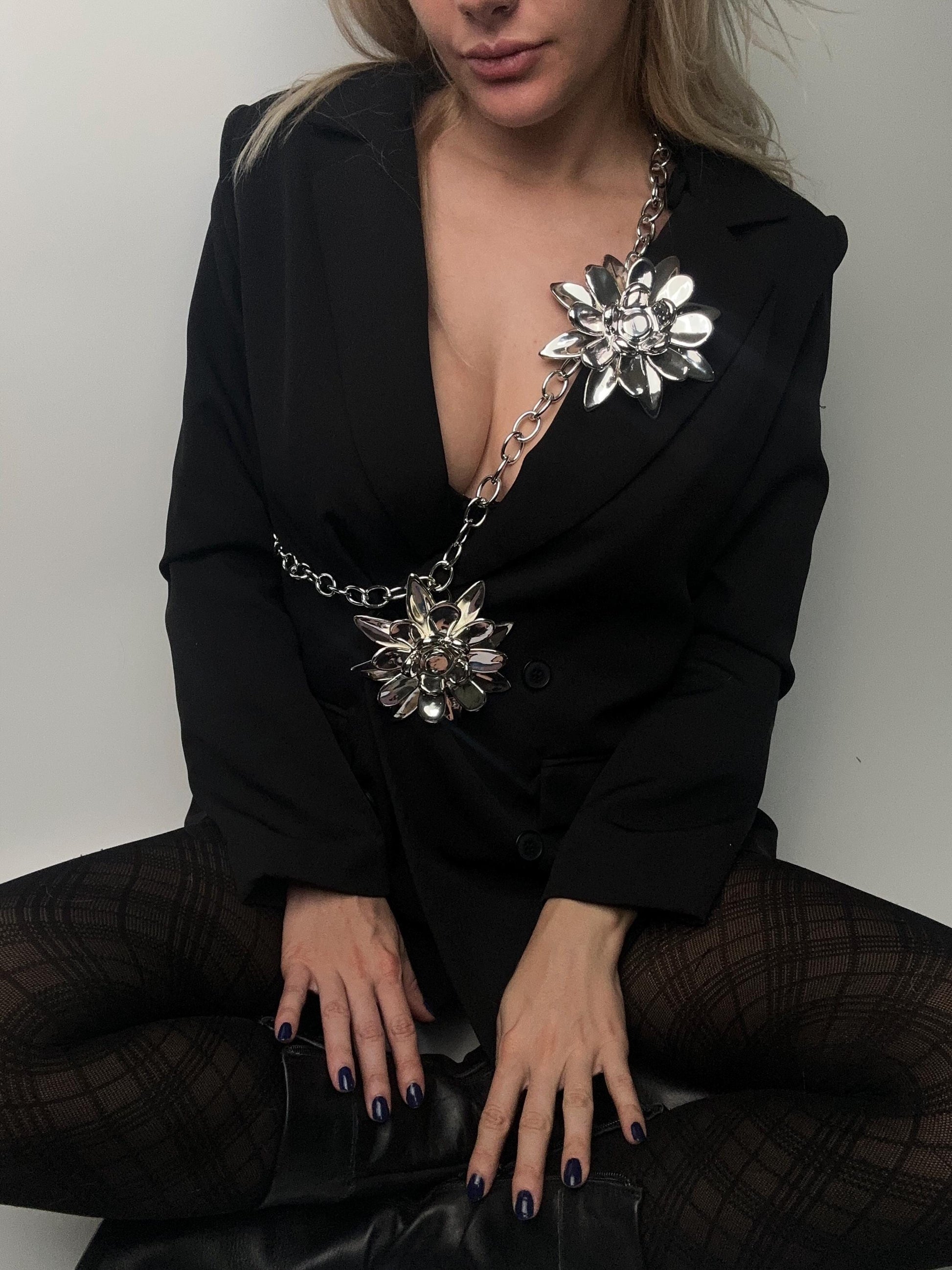 โจShine from every angle with this unique 3D printed chrome flower body belt!